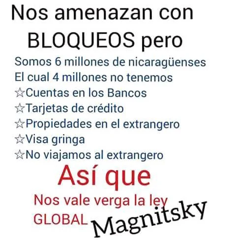 Pues sí. Es válida la aclaración. Si tu vida es tan mierda que ni a Costa Rica en bus has ido (y tampoco soñas con ir), pues definitivamente te vale sorbete lo que te puedan hacer los gringos con la tal Magnitsky. De hecho, viéndolo desde el punto de vista batracio, no tener nada es una bendición. Son intocables.