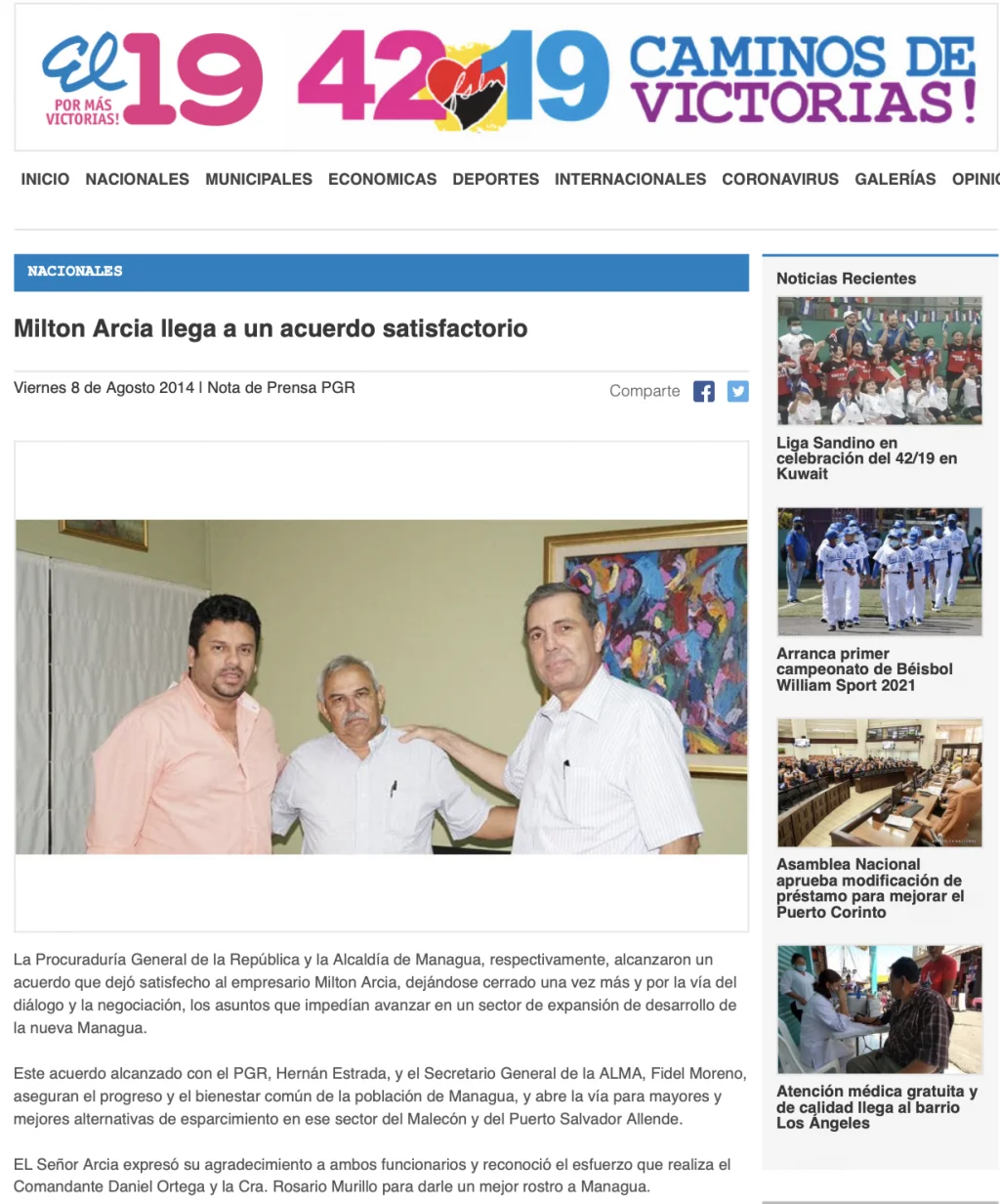 «El señor Arcia…reconoció el esfuerzo que realiza el Comandante Daniel y la Cra. Rosario Murillo por dale un mejor rostro a Managua.»